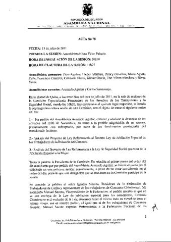 Las actas originales son transferidas por el órgano productor al Archivo General, presidencia de la asambleísta Nívea Vélez, Secretario Relator Fernando Calderón.