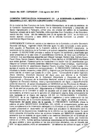 • Convocatoria al Secretario Nacional del Agua para que informe a la Comisión sobre el cumplimiento de la Ley Orgánica de Recursos Hídricos, Usos y Aprovechamiento del Agua.