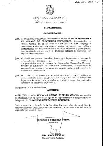 FELICITAR AL CIUDADANO DOUGLAS RAMÓN ANZULES MOLINA, ENTRENADOR DE ATLETISMO, POR SU SIGNIFICATIVO APORTE EN LA PREPARACIÓN E INTEGRACIÓN DE LA DELEGACIÓN DE OLIMPIADAS ESPECIALES ECUADOR EN ATENAS, CRECIA.