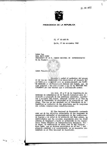 DECLARA OBRA PRIORITARIA DE INTERES NACIONAL Y DE URGENTE REALIZACION AL PROYECTO DE ABASTECIMIENTO DE AGUA POTABLE DE QUITO MICA-TAMBO.